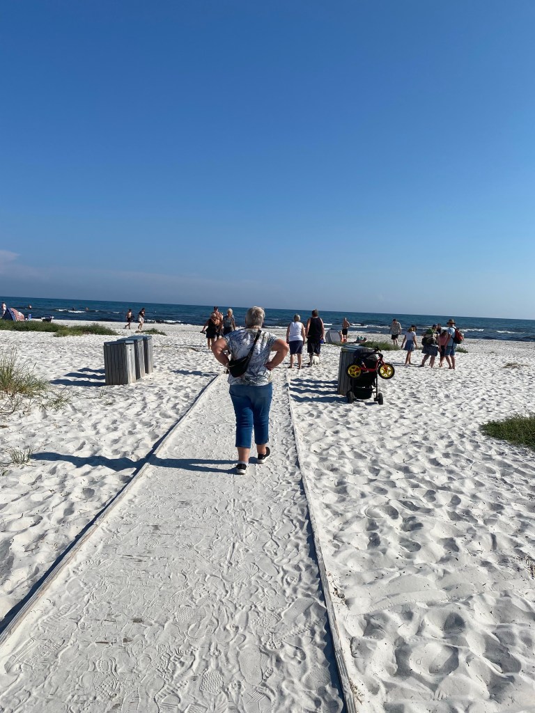 16/8: Alle på plass i bussen og veien går nå over den store Øresundbroa som tar oss til Sverige – Ystad og om bord i ferge til Rønne på Solskinnsøya. Og tenk: Her måtte sjåføren rygge om bord! Han klarte det med glans og vi ga ham APPLAUS. Ved ankomst Rønne møtte vi guiden Birgitte som guidet oss i Syd-Bornholm. Så til hotellet Griffen. Noen tok seg et aftenbad etter middag og kaffe. Havet ligger 30 meter fra hotellet. Strålende vær!