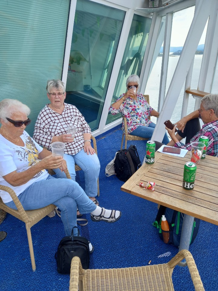 15/8: Avreise på morgenen. Mat og kaffestopp på Tollerud med medbrakte baguetter fra Froland. Om bord på Pearl Seaways i Oslo i strålende solskinn. 28 grader i skyggen. Noen på soldekk og noen i baren. Middagsbuffet om bord. Trang lugar, men god køye.